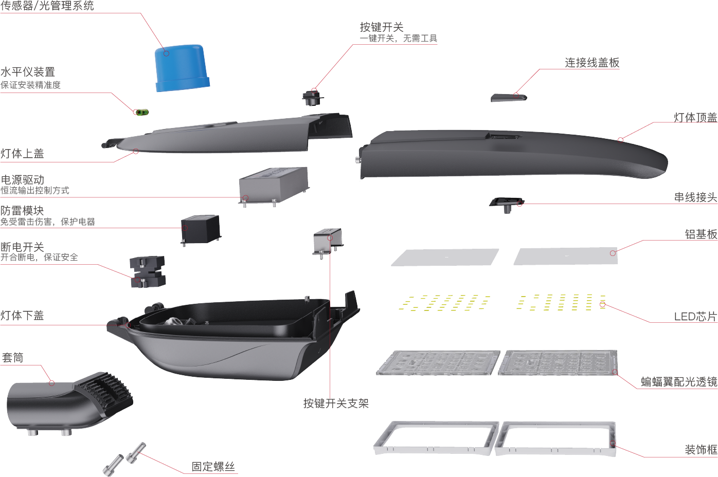 (外觀專利號:202230133221.1)高品質(zhì)工藝,流線型造型,外觀精美; 光源采用模組化設(shè)計易于安裝與維護; 便攜式按鈕開關(guān)設(shè)計,一鍵開關(guān)簡單方便,無需工具; 光控感應(yīng)技術(shù),實現(xiàn)智能節(jié)能; 采用蝙蝠翼型配光設(shè)計,提供均勻光分布。 適用于現(xiàn)代化城市、廣場、工業(yè)園區(qū)等場所的道路照明。